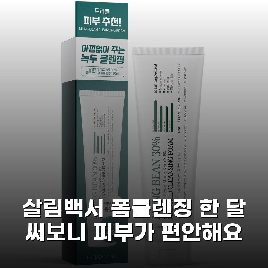 살림백서 녹두 폼클렌징 쓰고 피부가 편안해졌어요! 찰떡처럼 부드러운 거품이 노폐물을 싹 지워주고, 약산성이라 자극 없이 순해서 지성, 민감성 피부 모두 안심하고 쓸 수 있답니다. 150ml라 넉넉하게 오래 사용해요.